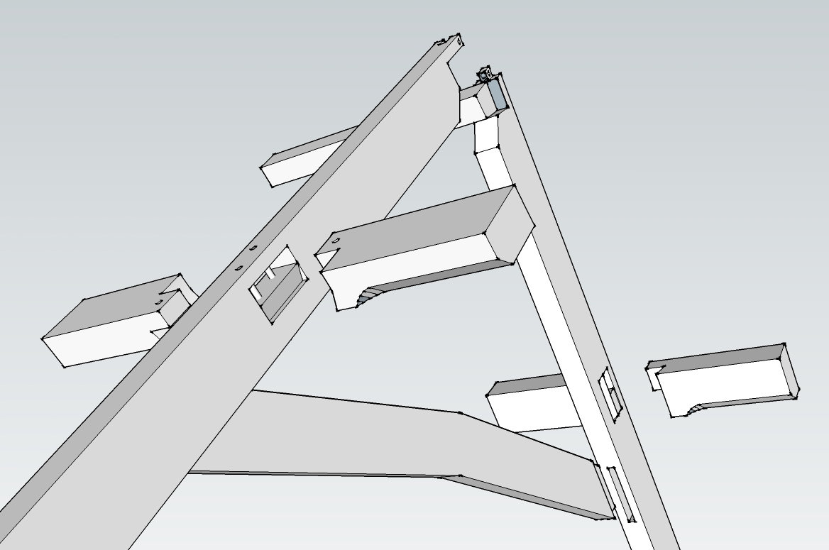 The purlins have open mortices, on the underside, with peg holes indicating former wind braces.
