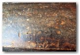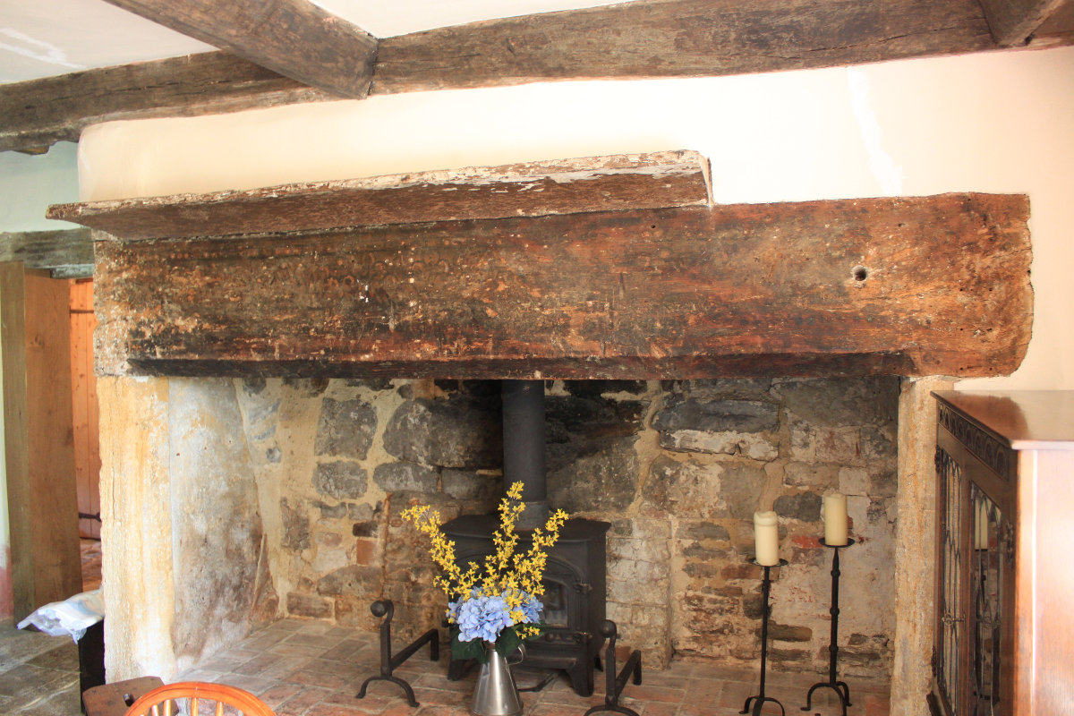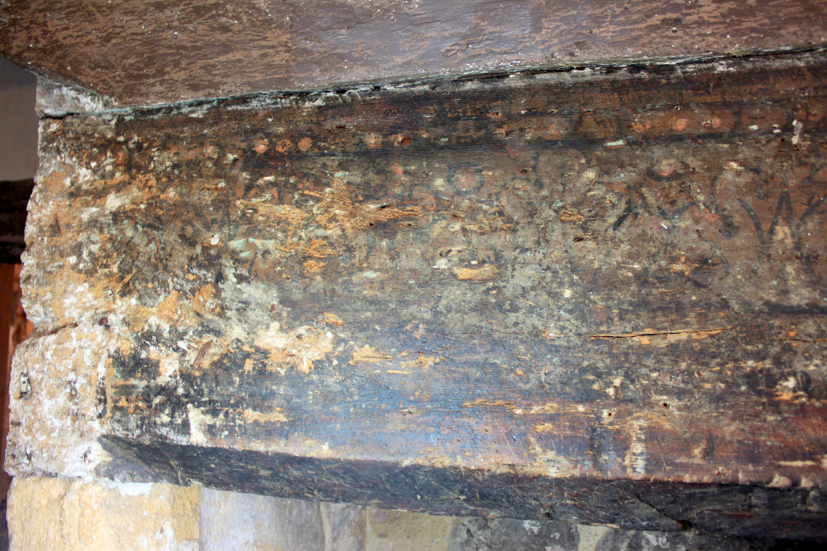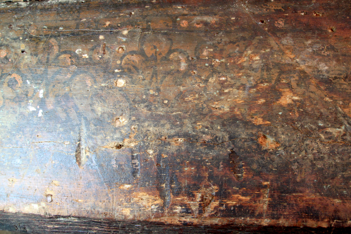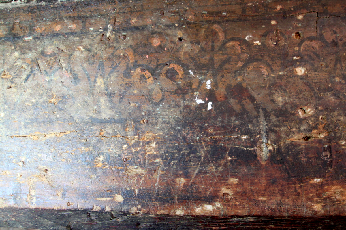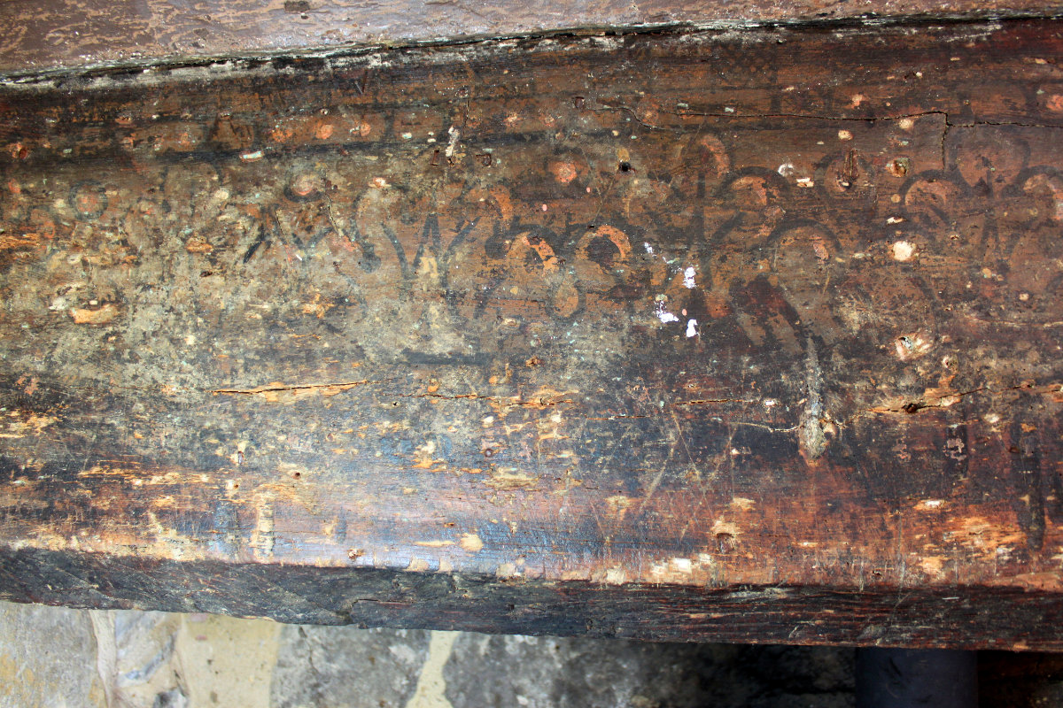 Found in a survey of a house on the Somerset levels, an original painted fireplace bressummer beam. The house looked to be early C16, and had a datestone of 1585. This was thought to be the date of the upgrade when the fireplace was inserted.