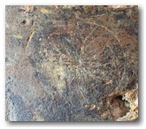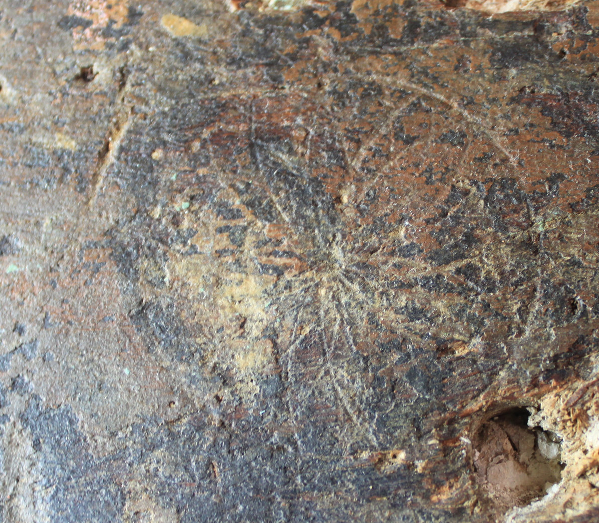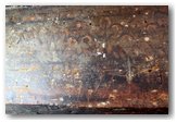 The painting is somewhat obscured by the inevitable smoke blackening from the fire. The pattern is repeated flower shapes, thought to be Fleur de Lys. These are below two courses of painted bricks and what looks like iron grates. There are also a series of dots and what could be "eye" symbols.